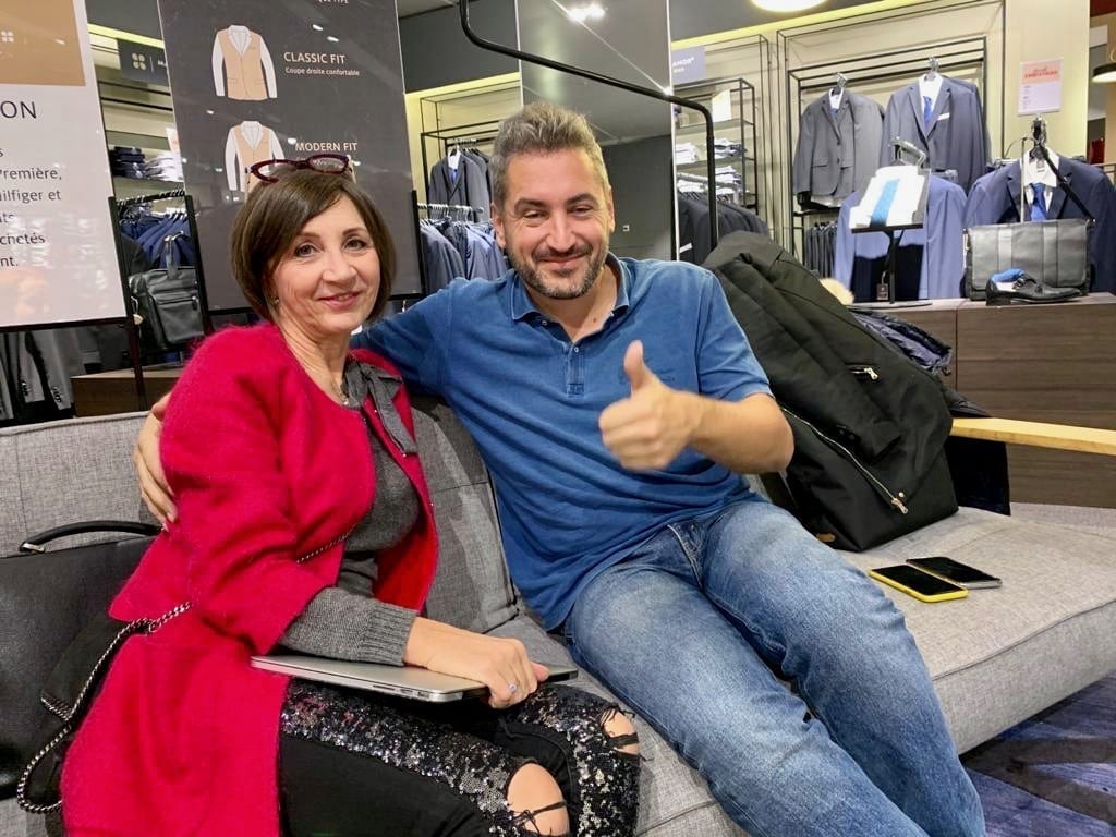 Résumons : D’abord la discussion avec le client, le choix théorique, bien installés dans un moelleux canapé. Mais très vite, on passe à l’action, le choix concret des habits ! Et hop, trolley en tête, Myriam qui scrute, et Antoine qui suit, assez détaché et en même temps très connecté. On est influenceur ou on ne l’est pas, n’est-ce pas ! La communauté, c’est tout pour Antoine. Bon, il a aussi une sacrée personnalité, une incroyable joie de vivre et un caractère… avenant et fort, on dira.